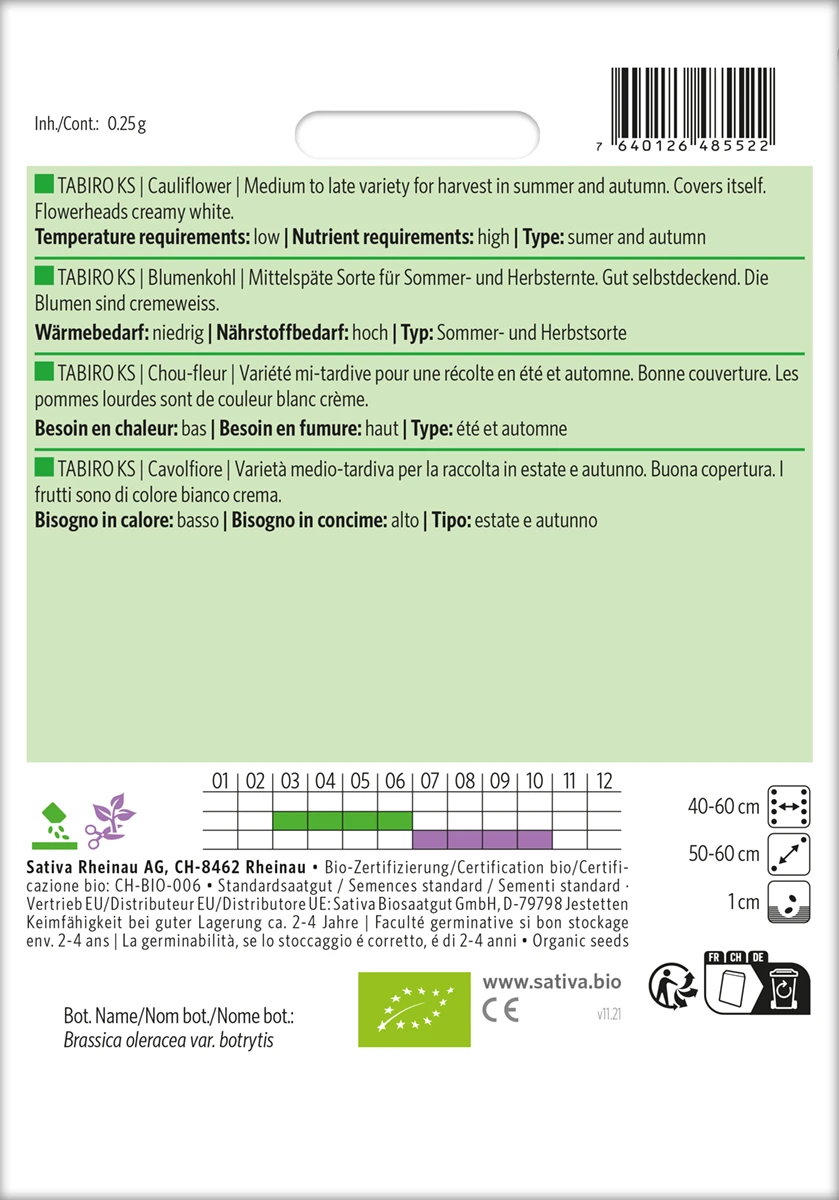 Mittelspäte Sorte für Sommer- und Herbsternte. Gut selbstdeckend. Die Blumen sind cremeweiss.