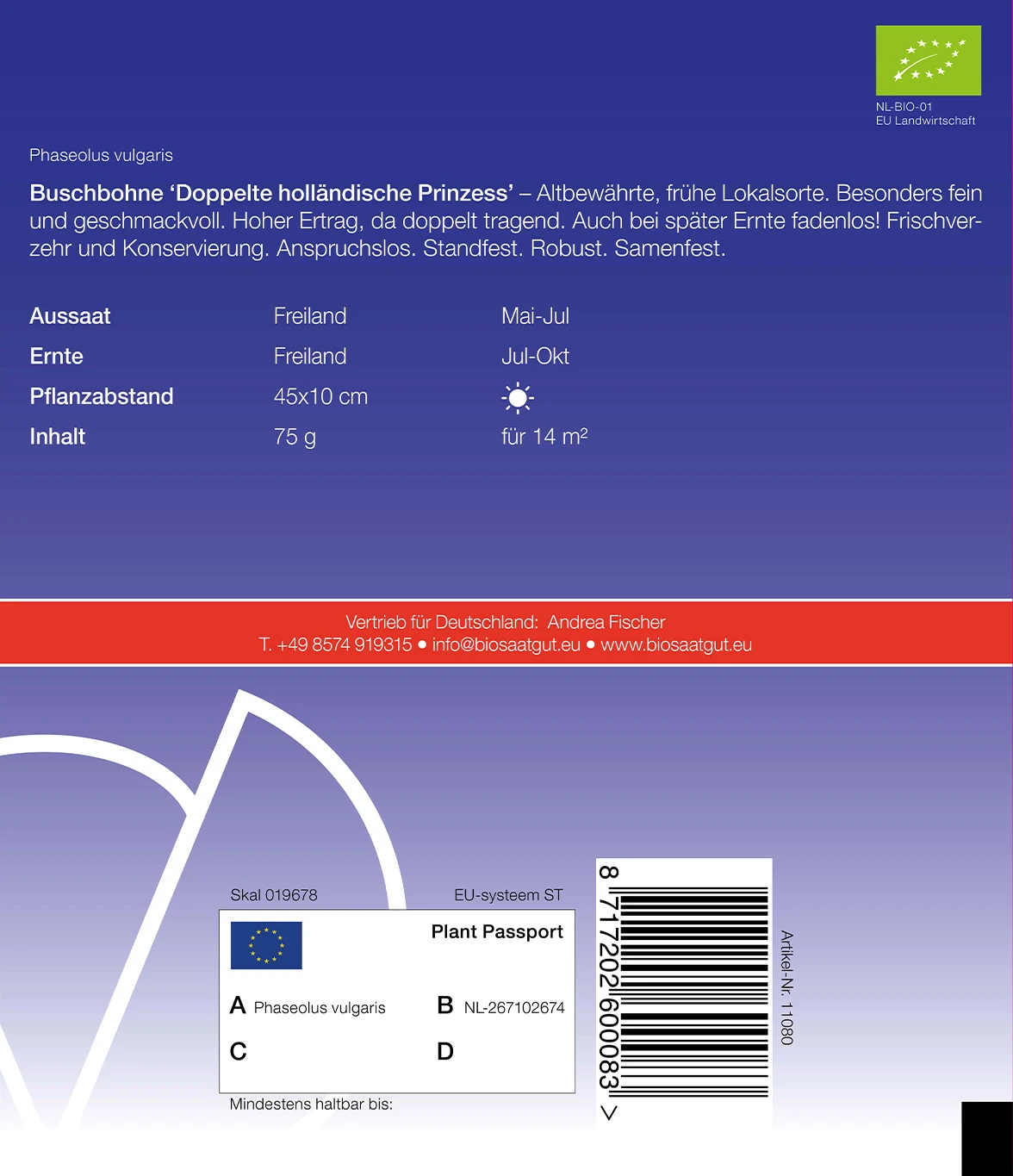 Altbewährte, frühe Lokalsorte. Besonders fein und geschmackvoll. Hoher Ertrag, da doppelt tragend. Auch bei später Ernte fadenlos! Frischverzehr und Konservierung. Anspruchslos. Standfest. Robust. Samenfest.
