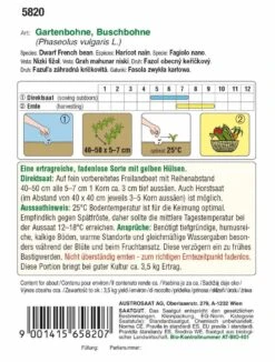 Benötigt tiefgründige, humusreiche, kalkige Böden, warme Standorte und gleichmäßige Wassergaben besonders während der Blüte und beim Fruchtansatz. Diese verzögern ein zu frühes Bastigwerden. Nicht überständig ernten – zum richtigen Erntezeitpunkt fadenlos. Diese Portion bringt bei guter Kultur ca. 3,5 kg Ertrag.