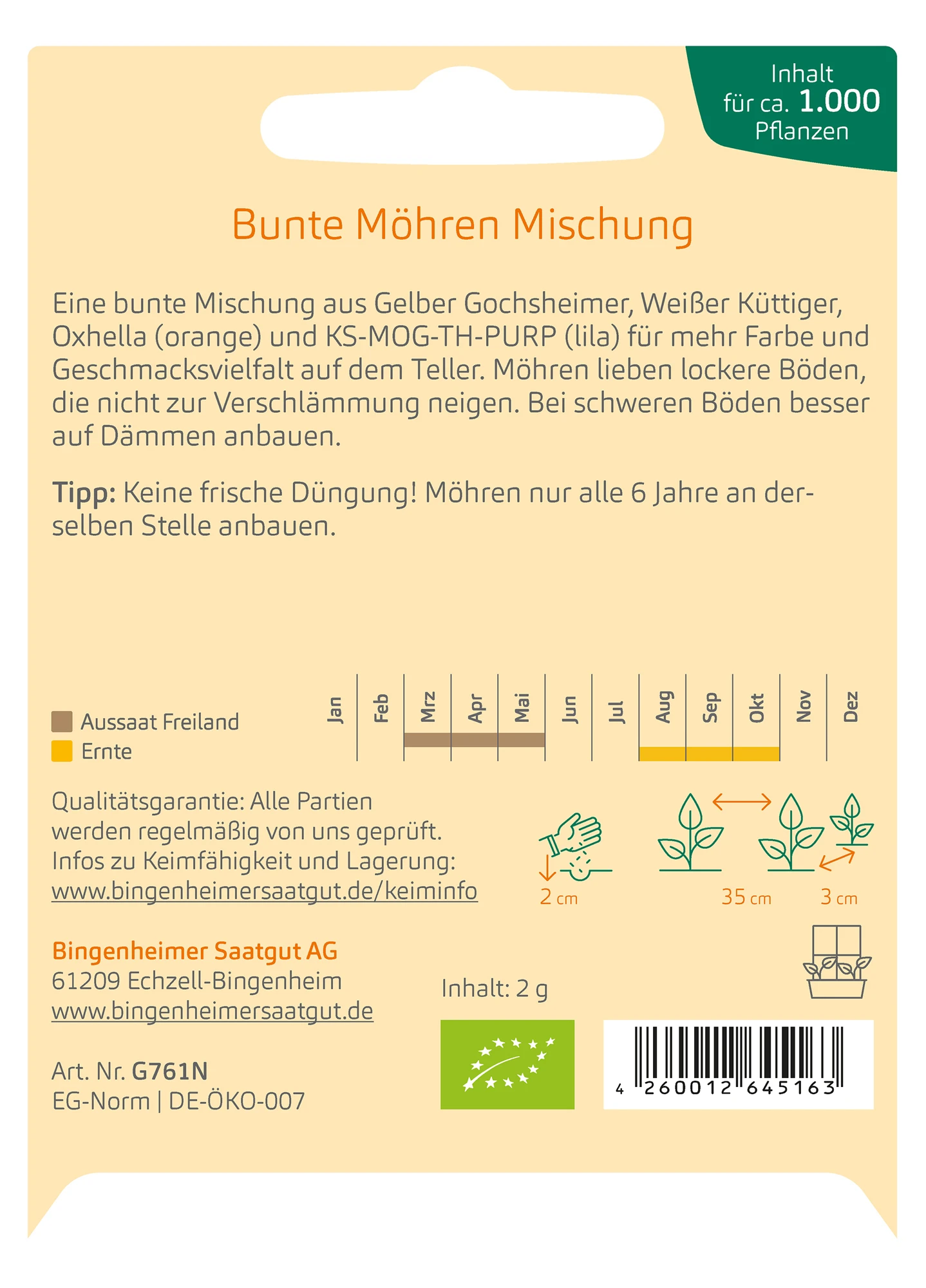 Eine bunte Mischung aus Gelber Gochsheimer, Weißer Küttiger, Oxhella (orange) und KS-MOG-TH-PURP (lila) für mehr Farbe und Geschmacksvielfalt auf dem Teller. Möhren lieben lockere Böden, die nicht zur Verschlämmung neigen. Bei schweren Böden besser auf Dämmen anbauen.