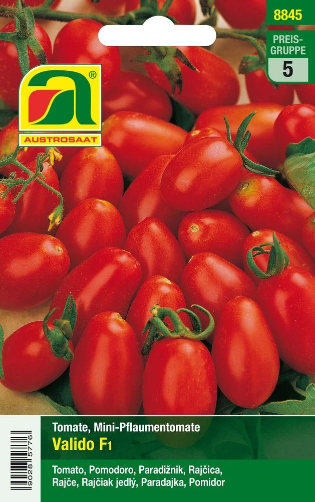 Die Austrosaat Tomate Valido F1 (Solanum lycopersicum L.) ist ein rote Mini-Pflaumentomate mit hohem Zuckergehalt und einem durchschnittlichen Fruchtgewicht von 18 – 22 g. Die Kultur an Stöcken erfolgt eintriebig oder mit einem Seitentrieb.